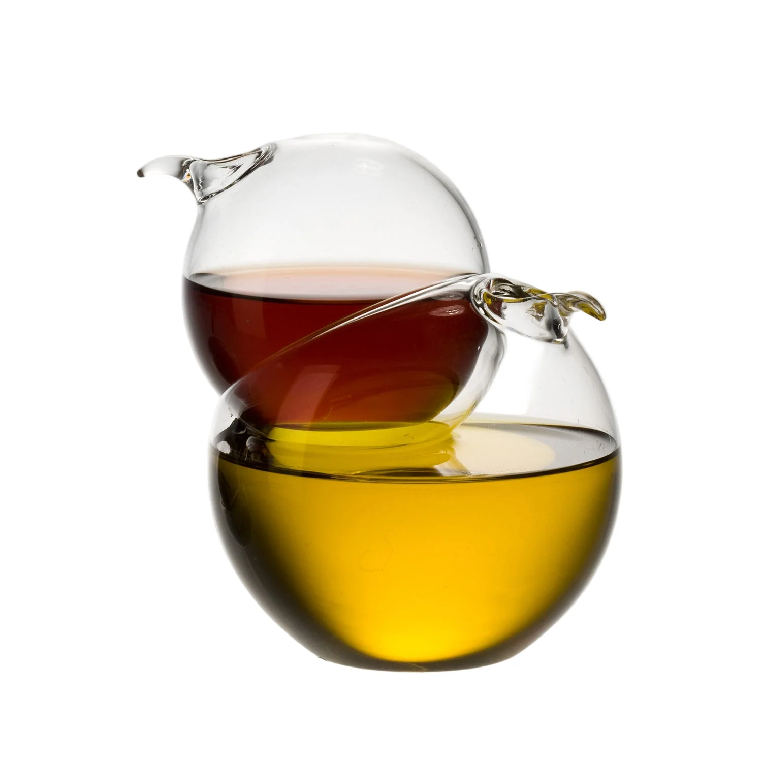 Inseparables Oil and Vinegar Set features two vessels, one large and one small, made of mouth-blown borosilicate glass. The vessels nest within one another to create a sculptural interpretation of a familiar form. Sculpted with a spout to provide an even pour when serving your favorite oil and vinegar.