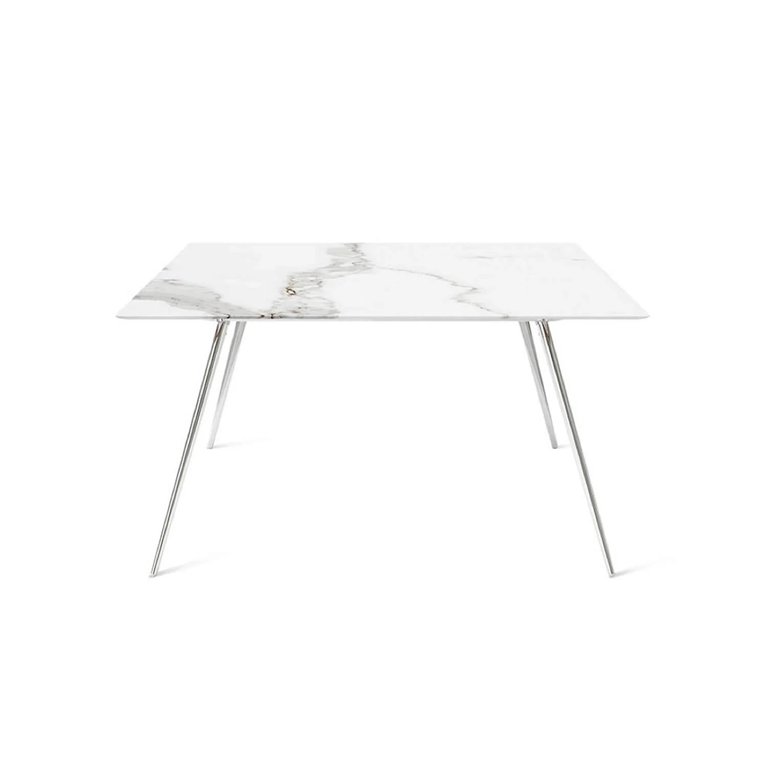 The Stay Table bears a lightness that soothes the eye and a sturdy structure that complements its tactile quality. Its slender legs are made of a conical tube with a polished chrome, brass, or a matte varnished finish in white, mud, or anthracite.