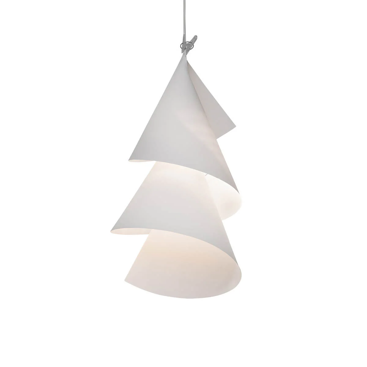 Designed by Ingo Maurer, the WillyDilly Pendant lamp resembles an origami sculpture. Subtle and organic, the lamp is made of white transparent cardboard that is easily attached to the supply line by a clear-colored clamp. The distinct shape of the shade is assembled by the owner and can be varied as desired. Minimal yet fun, the WillyDilly Pendant lamp adds a delicate edge to both commercial or residentail spaces.